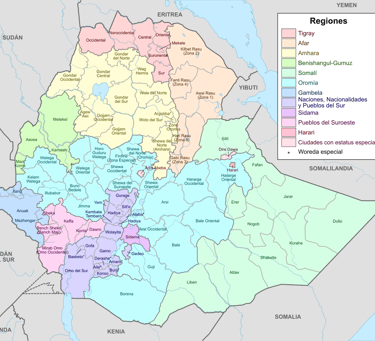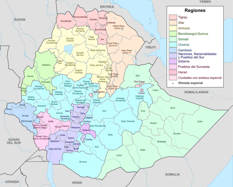 Las 9 regiones administrativas de Etiopía (Fuente: Wikipedia)