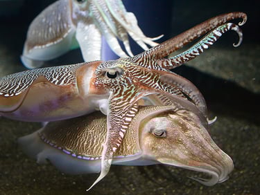 Los calamares, más sociales que las sepias, también comunican la disponibilidad para aparearse con el color de su piel. Aunque se reúnan en grupos de 10 a 30 individuos, pronto se deshacen en grupos de cortejo formados por una hembra y entre 2 y 5 machos. Por lo general, el macho de mayor tamaño aleja a la hembra del resto de pretendientes y ambos se entregan a un balanceo precopulatorio en el que se desplazan de un lado al otro. Sin embargo, el macho debe tener cuidado porque si se acerca demasiado, la hembra puede alejarse veloz como un rayo. El calamar macho emplea el disfraz de cebra de una forma no muy diferente a la de la sepia para ahuyentar a otros machos, incluso puede adquirir una coloración unilateral al igual que las sepias. Pero existen diferencias entre estos dos grupos de cefalópodos, ya que los calamares no se abrazan para aparearse. En lugar de eso, el macho intenta acercar a la hembra un pequeño y pegajoso saco de esperma (espermatóforo). Al mismo tiempo, los cromatóforos del calamar palpitan a un ritmo determinado. Cuando la hembra coloca el saco de esperma en su receptáculo seminal, el ritual de apareamiento concluye.