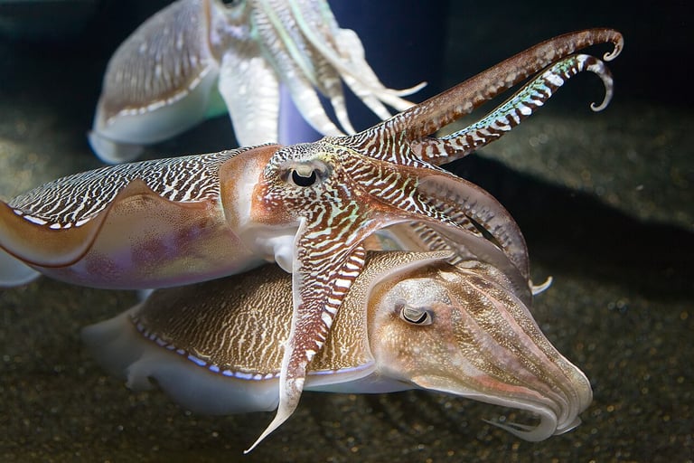 Patrón de coloración cebra (macho) y jaspeado (hembra) en dos sepias (Fuente: Wikipedia)
