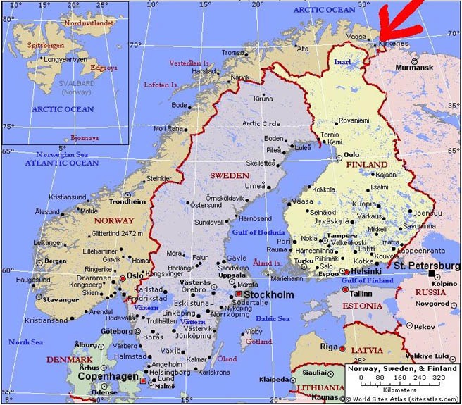 Mapa de los países nórdicos de Europa con la ciudad noruega de Kirkenes señalizada (Fuente: Lanforsen)