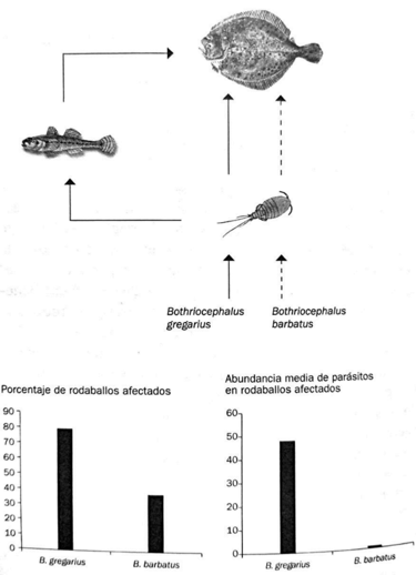 Abundancia de parásitos y frecuencia de infección de rodaballos por B. barbatus (un solo hospedador intermedio) y B. gregarius (2 hospedadores intermedios (Fuete: Poulin, 1998)
