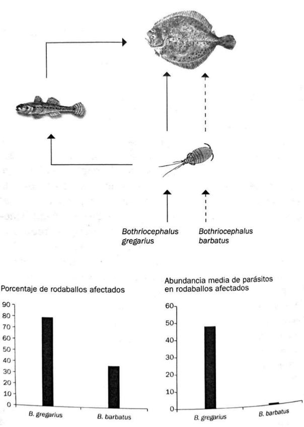 Existen dos especies “hermanas” de cestodos (platelmintos como la tenia) del género Bothriocephalus que utilizan pequeños crustáceos (copépodos) como hospedadores intermedios y al rodaballo como hospedador definitivo. La especie B. barbatus vive en los copépodos y llega al rodaballo cuando éste ingiere estos pequeños crustáceos junto con su alimento. La segunda especie, B. gregarius, al igual que la primera, puede llegar a su hospedador definitivo cuando el rodaballo ingiere copépodos parasitados, pero, además, también puede transmitirse por esta misma vía a los gobios (otro pez) que a su vez será el alimento del rodaballo (hospedador definitivo). Mientras una especie presenta dos hospedadores intermedios (copépodos y gobios) la otra solo presenta uno (copépodos). En función del porcentaje de ambas especies que acaba parasitando a los rodaballos, podremos determinar cuál de las dos estrategias de parasitismo es más eficaz. Resulta que los que empleaban dos hospedadores intermedios (B. gregarius) aparecía en mayor porcentaje de rodaballos y en mayores densidades, demostrando la mayor eficacia de esta estrategia. Sin embargo, puede ocurrir lo contrario, como en el caso de que un parásito consiga reproducirse en un hospedador intermedio, sin la necesidad de acceder al definitivo. En este caso, la eliminación de uno de los hospedadores de su “cadena de parasitismo” será beneficiosa para el parásito, ya que necesitará superar un menor número de barreras defensivas.