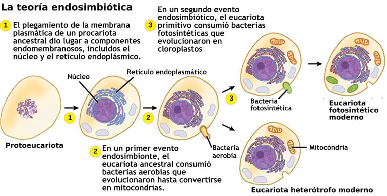 Hace más de mil millones de años, cuando la Tierra sólo estaba habitada por células procariotas (sin núcleo) como las bacterias, en una charca burbujeante cualquiera, una de estas bacterias envolvió una más pequeña, convirtiéndose en nuestro antepasado común. No sabemos con exactitud cómo ocurrió, puede que la primera bacteria quisiera alimentarse de la más pequeña, o puede que la segunda buscara un mejor hogar como parásito. Pero lo que sí sabemos es que la bacteria pequeña se quedó dentro de la grande, y, de hecho, sus descendientes siguen formando parte de nuestro cuerpo. Esto es lo que se conoce como la teoría endosimbiótica de Lynn Margulis, una científica que postuló esta idea para explicar evolutivamente el paso de las células procariotas (sin núcleo ni orgánulos) a las células eucariotas (con núcleo y orgánulos). Aunque ambas bacterias pertenecieron originalmente a dos especies distintas, cientos de millones de años de evolución después, se fundieron en una sola y ahora son inseparables.